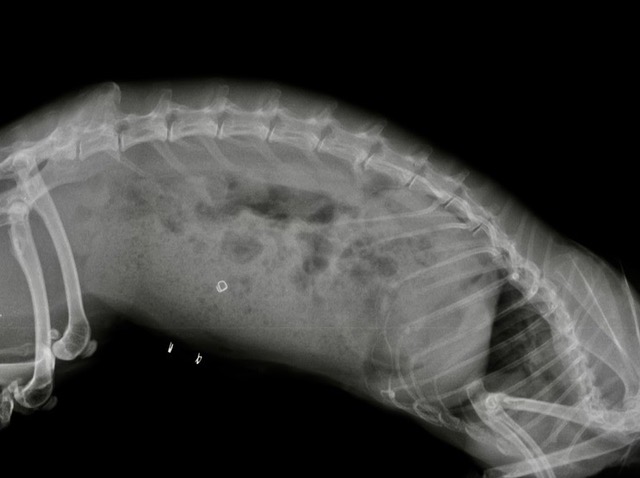 レントゲンでステープルを飲み込んだことを確認した後、不本意ながらエリザベスカラーを装着。