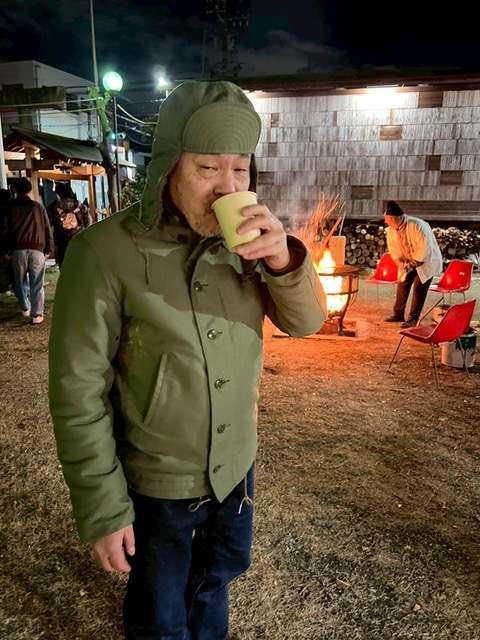 参拝しないくせに、甘酒を美味そうに飲むフライトキャップのオッサン。