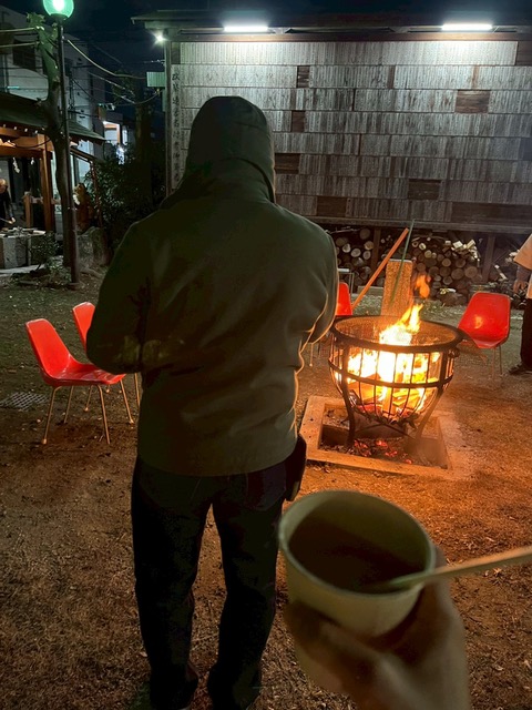 行列を嫌い、参拝もせず、ここでも焚火で暖を取るオッサン。