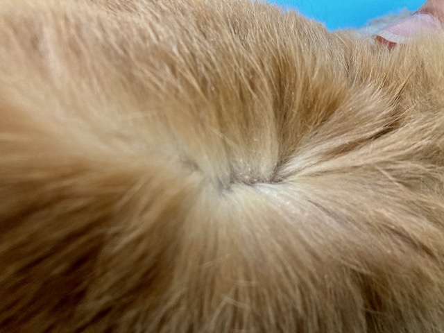 画像のウサギの背中、被毛を除けて覗いた地肌に、ほんのわずかにフケがあるのわかりますか?