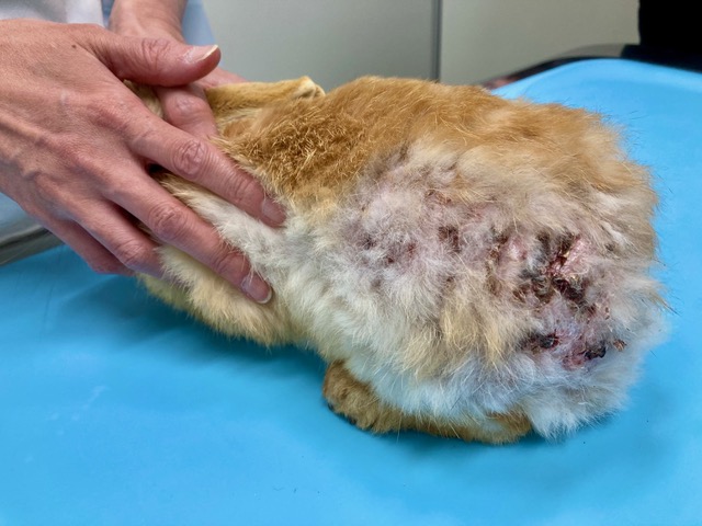 今回のウサギは、過密な集団飼育環境で他の個体から執拗にいじめられていたようで、全身に痛ましい咬まれ傷が多数見られました。