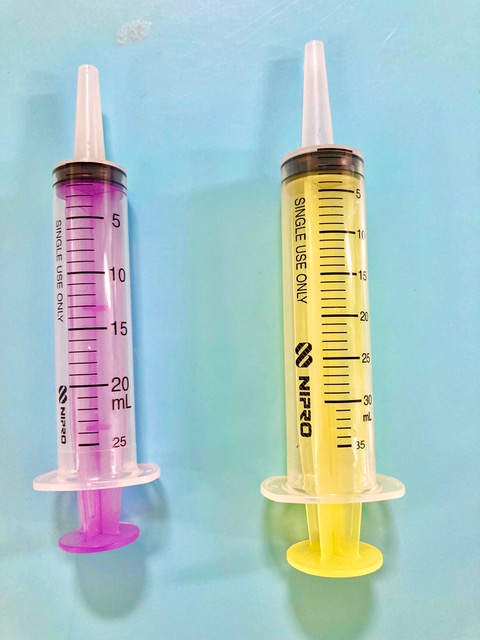 一昔前なら2〜3kgの患者さんがざらにいたので、右(黄色)の30mlのカテーテルチップ(先端が太い)シリンジを利用していましたが、最近はペットウサギの小型化が進んでいるので、左(紫色)の20mlが主流になっています。