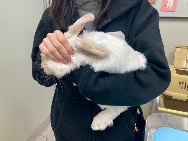 ポイントは、ウサギの逃走本能を抑えるために目隠しをすること、そして息苦しくならないよう胸を圧迫しないこと。