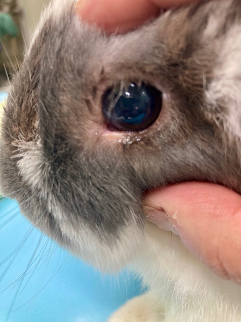 ちょうど2ヶ月前、脱出した第三眼瞼腺を切除する手術を受けたオスのウサギ。